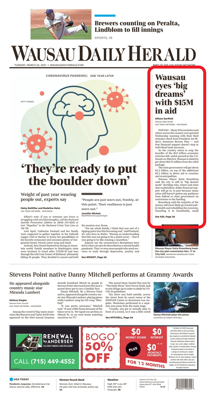 Wausau Daily Herald: 'We're in big dreams mode': Wausau to get $15 million in COVID-19 relief from American Rescue Plan